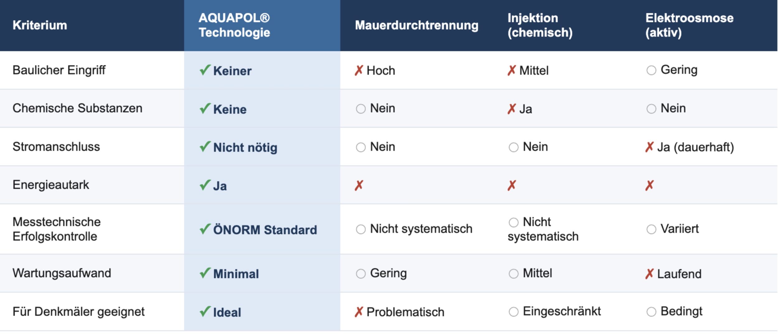 Zur Beseitigung von kapillar aufsteigender Feuchtigkeit im Mauerwerk stehen verschiedene Verfahren zur Verfügung: mechanische Horizontalsperren, chemische Injektionsverfahren, elektroosmotische Systeme sowie energieautarke Systeme wie AQUAPOL®.